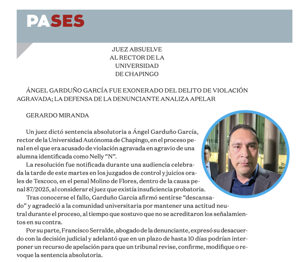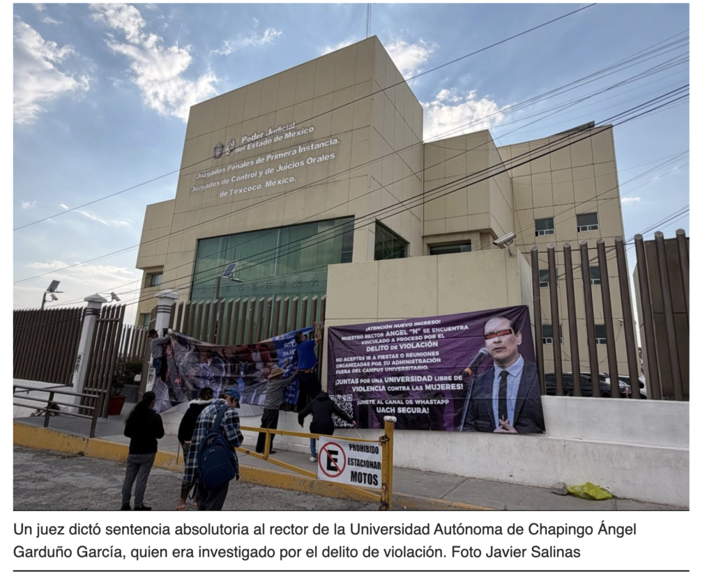El rector de la Universidad Autónoma Chapingo (UACh) Ángel Garduño García fue declarado inocente y absuelto por la autoridad judicial con sede en Texcoco, del delito de abuso sexual equiparado en agravio de una alumna identificada como Nelly.