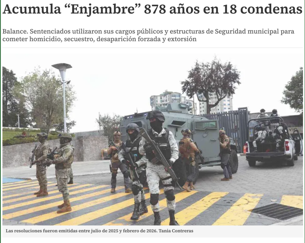 La “Operación Enjambre” acumula, hasta ahora, al menos 878 años de prisión derivados de sentencias dictadas en contra de 18 objetivos prioritarios procesados por delitos como homicidio, secuestro, desaparición forzada y extorsión.
