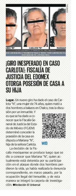 Un nuevo giro ha dado el caso de Carlota “N”, una mujer de 74 años, quien mató a dos hombres a balazos en Chalco, tras la discusión por un inmueble. Y es que se ha dado a conocer que la FGJEM determinó conceder la poseción de la casa en la disputa a Mariana “N” hija de la señora Carlota, luego de que se dio a conocer que Mariana “N” quien actualmente esta detenida, ya había realizado la denuncia correspondiente en marzo pasado por la ocupación ilegal del inmueble.