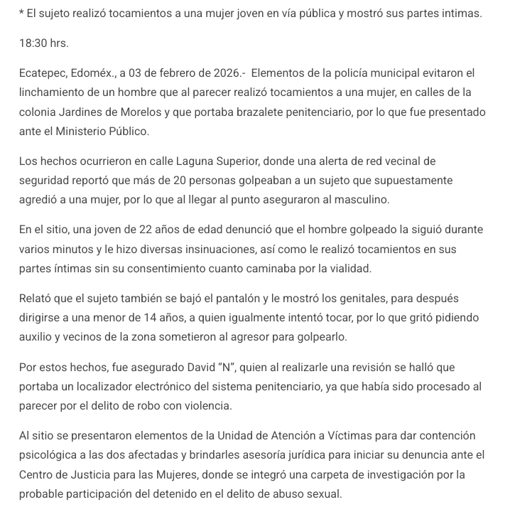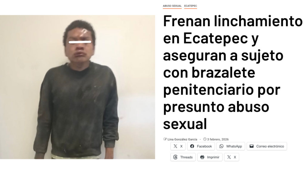 - https://reporterosenmovimiento.com/2026/02/03/frenan-linchamiento-en-ecatepec-y-aseguran-a-sujeto-con-brazalete-penitenciario-por-presunto-abuso-sexual/?utm_source=facebook&utm_medium=jetpack_social&fbclid=IwY2xjawPwTTtleHRuA2FlbQIxMQBzcnRjBmFwcF9pZBAyMjIwMzkxNzg4MjAwODkyAAEer26R54EtaTrK8vp2jtiHHA2E835GWLZCYFFXfsren3eLFoVzMbUA-vE7Hgc_aem_Y8jIDaFQ0Zg-ZFaXQ8EL2A#google_vignette