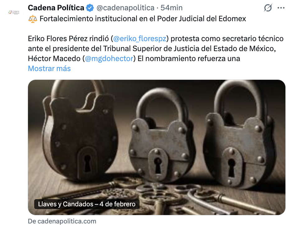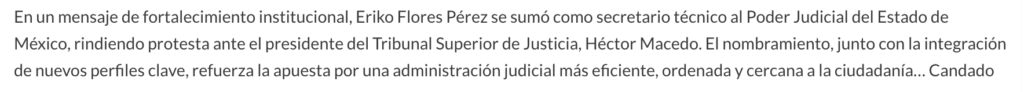 En un mensaje de fortalecimiento institucional, Eriko Flores Pérez se sumó como secretario técnico al Poder Judicial del Estado de México, rindiendo protesta ante el presidente del Tribunal Superior de Justicia, Héctor Macedo. El nombramiento, junto con la integración de nuevos perfiles clave, refuerza la apuesta por una administración judicial más eficiente, ordenada y cercana a la ciudadanía… Candado