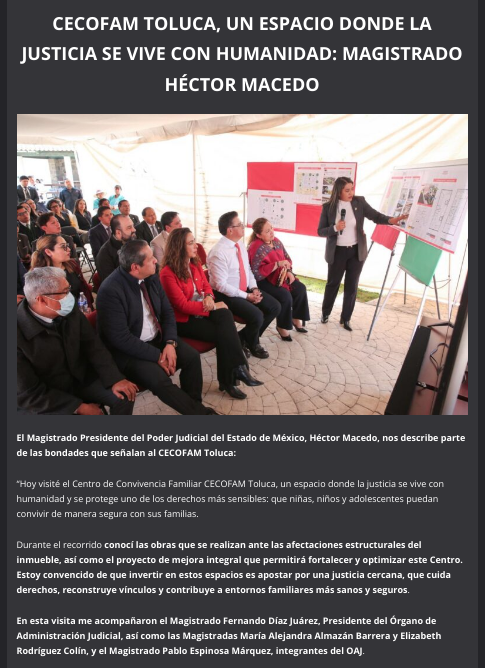 “Hoy visité el Centro de Convivencia Familiar CECOFAM Toluca, un espacio donde la justicia se vive con humanidad y se protege uno de los derechos más sensibles: que niñas, niños y adolescentes puedan convivir de manera segura con sus familias.