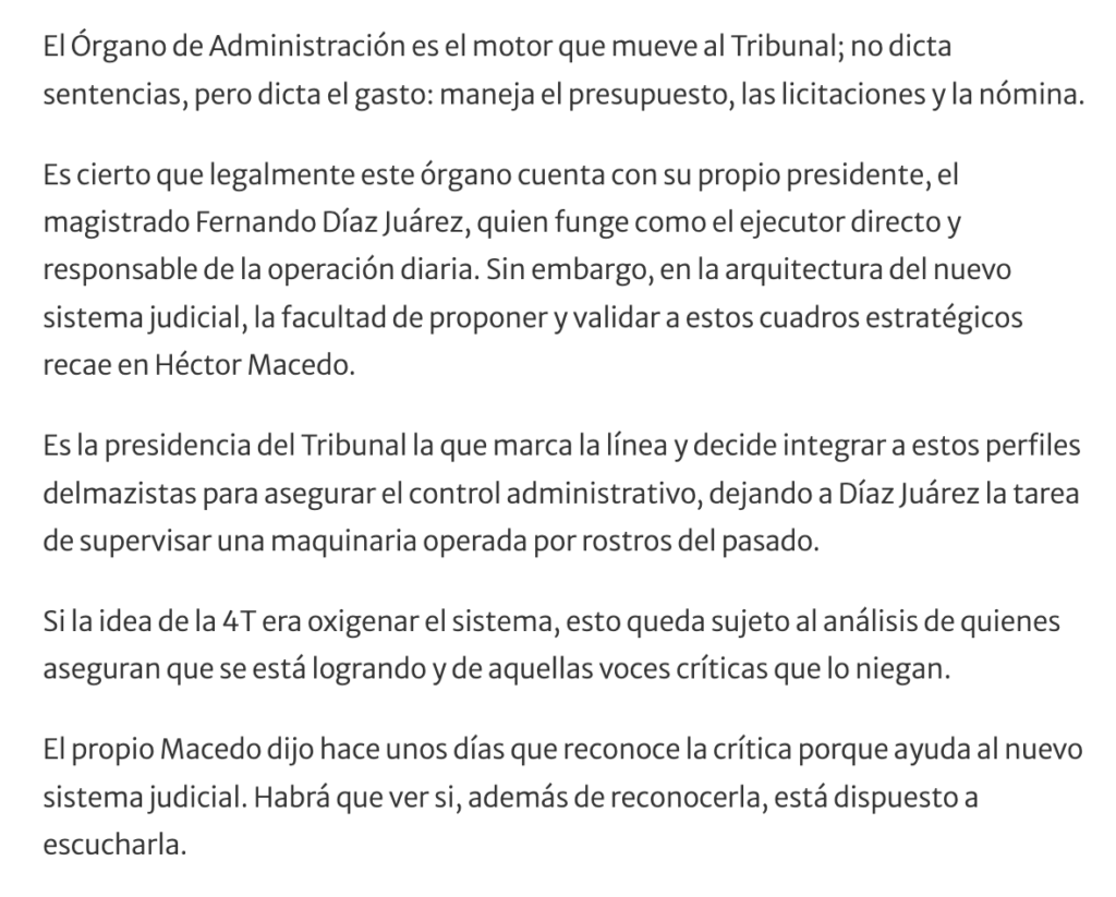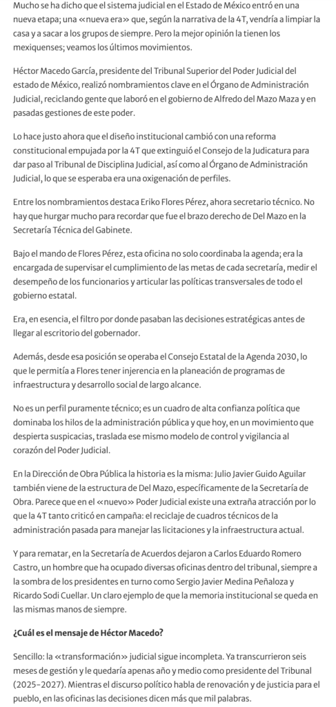 Héctor Macedo García, presidente del Tribunal Superior del Poder Judicial del estado de México, realizó nombramientos clave en el Órgano de Administración Judicial, reciclando gente que laboró en el gobierno de Alfredo del Mazo Maza y en pasadas gestiones de este poder.