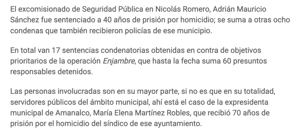 El pasado fin de semana se dio a conocer una nueva sentencia condenatoria en la que está relacionado un ex servidor público del ámbito municipal y específicamente del área de seguridad, todo ello como resultado de la instrumentación del operativo Enjambre.