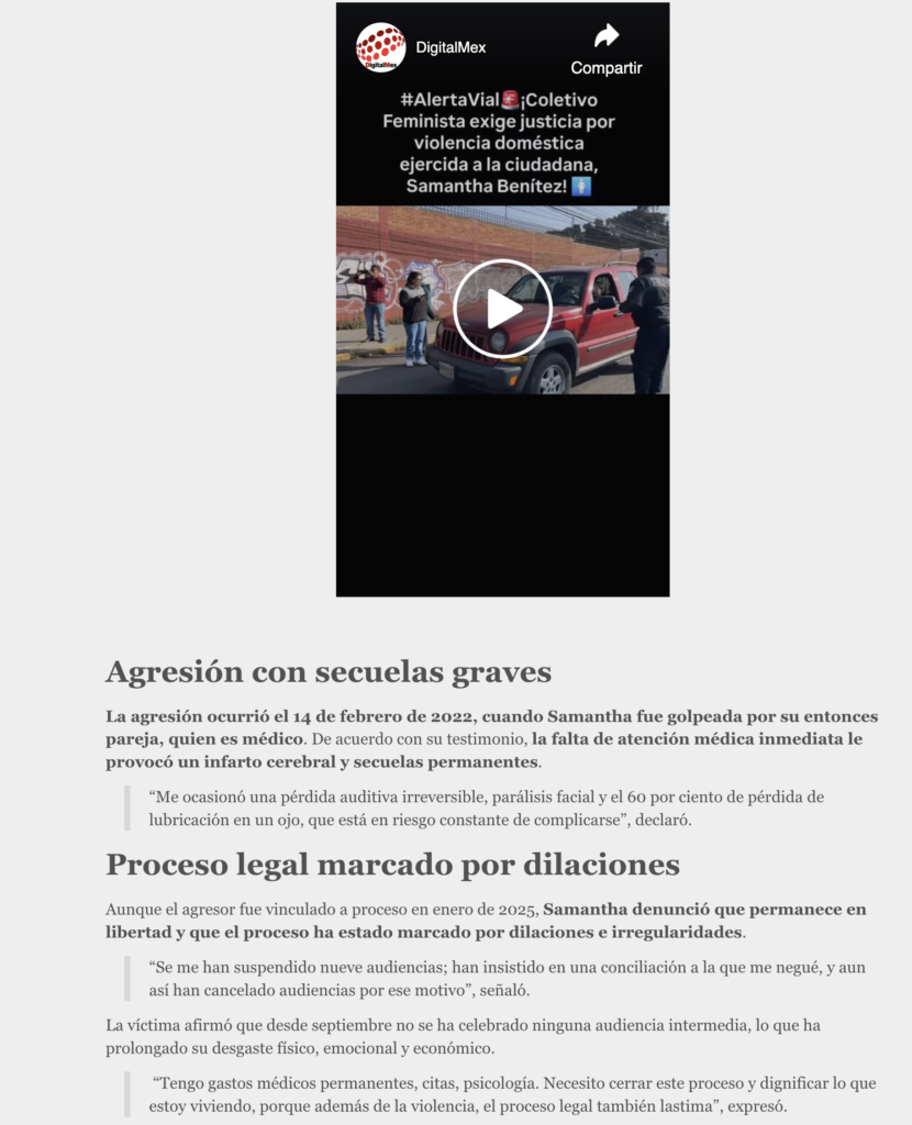 Samantha denunció que, pese a estar vinculado a proceso por vi0l3nc1a doméstica, su agr3s0r continúa en libertad y su caso ha enfrentado constantes cancelaciones de audiencias.