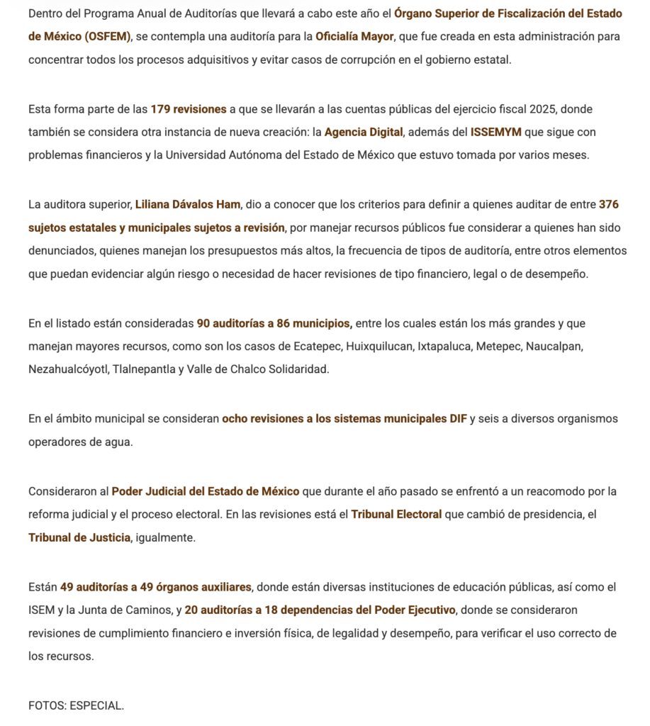 Consideraron al Poder Judicial del Estado de México que durante el año pasado enfrentó a un reacomodo para la reforma judicial y el proceso electoral. En las revisiones está el Tribunal Electoral que cambió de presidencia, el Tribunal de Justicia, igualmente.