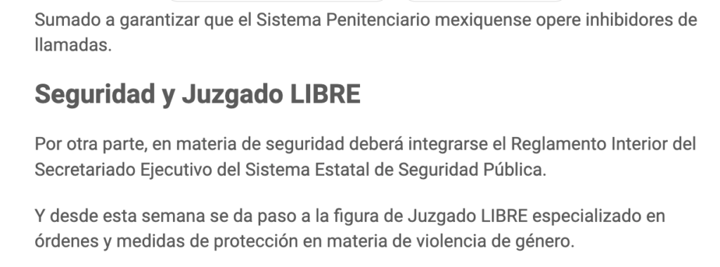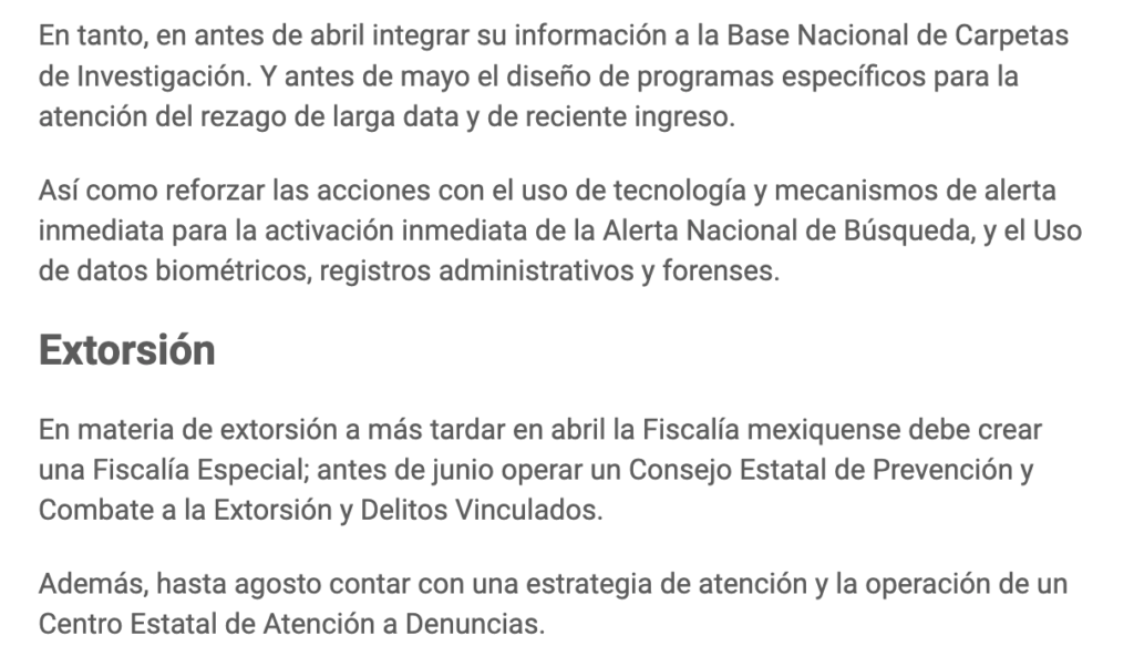 En los próximos 6 meses las autoridades de seguridad y justicia deberán asignar recursos y hacer ajustes homologar base de datos en desapariciones; crear una Fiscalía Especial contra la extorsión y garantizar inhibidores de celulares los penales; y poner en operación el Juzgado LIBRE.