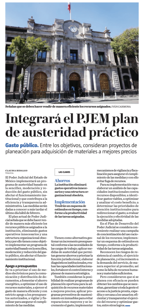 El Poder Judicial del Estado de México implementará un programa de austeridad basado en la sencillez, moderación y reducción del gasto público, sin afectar el funcionamiento institucional y que contribuya a la eficiencia y transparencia administrativa. Las medidas serán dadas a conocer a más tardar el último día de febrero.