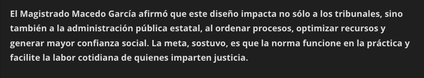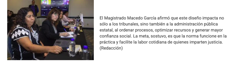 Durante el desarrolló del evento en el que también participaron el Magistrado Fernando Díaz Juárez y la Magistrada Elizabeth Rodríguez Colín, Presidente e integrante del Órgano de Administración Judicial, Macedo García detalló que el proyecto, promovido desde la Comisión Nacional de Tribunales Superiores de Justicia de los Estados Unidos Mexicanos (Conatrib), busca ofrecer a las entidades una guía legal, operativa y de gobernanza ajustable a sus contextos, sustentada en bases compartidas que fortalezcan el equilibrio institucional, la rendición de cuentas, el desempeño administrativo y, de manera prioritaria, la atención a la población.