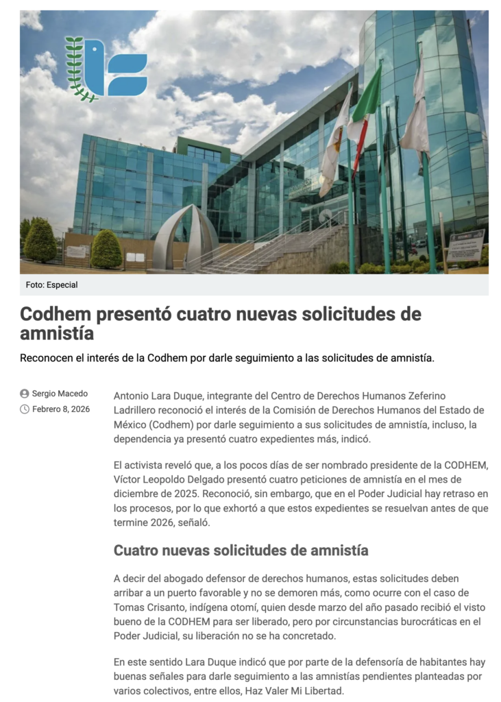 El activista reveló que, a los pocos días de ser nombrado presidente de la CODHEM, Víctor Leopoldo Delgado presentó cuatro peticiones de amnistía en el mes de diciembre de 2025. Reconoció, sin embargo, que en el Poder Judicial hay retraso en los procesos, por lo que exhortó a que estos expedientes se resuelvan antes de que termine 2026, señaló.