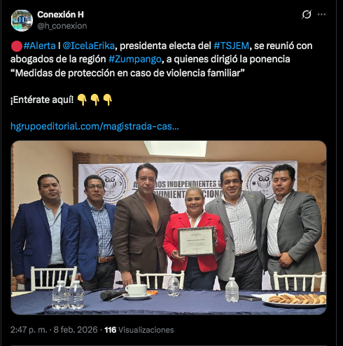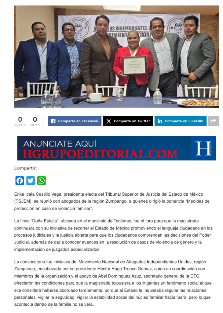 Erika Icela Castillo Vega, presidenta electa del Tribunal Superior de Justicia del Estado de México (TSJEM), se reunió con abogados de la región Zumpango, a quienes dirigió la ponencia “Medidas de protección en caso de violencia familiar”.