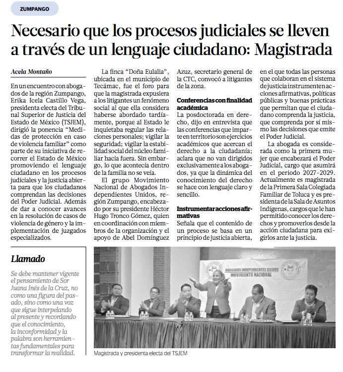 La finca “Doña Eulalia”, ubicada en el municipio de Tecámac, fue el foro para que la magistrada continuara con su iniciativa de recorrer el Estado de México promoviendo el lenguaje ciudadano en los procesos judiciales y la justicia abierta para que los ciudadanos comprendan las decisiones del Poder Judicial, además de dar a conocer avances en la resolución de casos de violencia de género y la implementación de juzgados especializados.