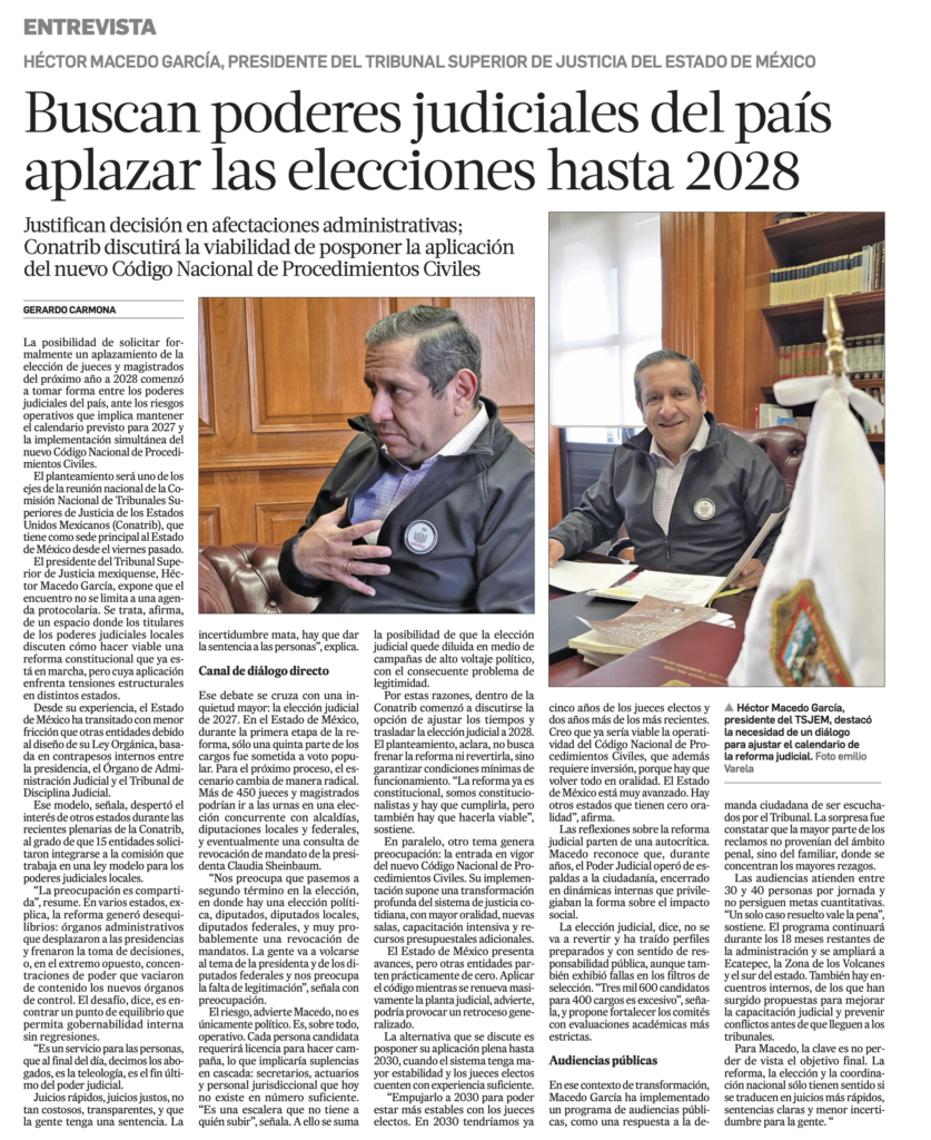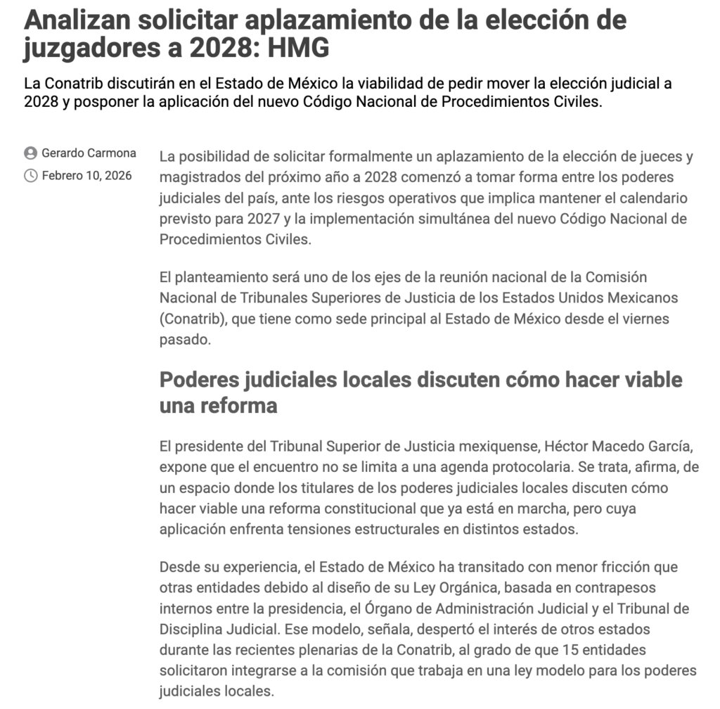 La posibilidad de solicitar formalmente un aplazamiento de la elección de jueces y magistrados del próximo año a 2028 comenzó a tomar forma entre los poderes judiciales del país, ante los riesgos operativos que implica mantener el calendario previsto para 2027 y la implementación simultánea del nuevo Código Nacional de Procedimientos Civiles.