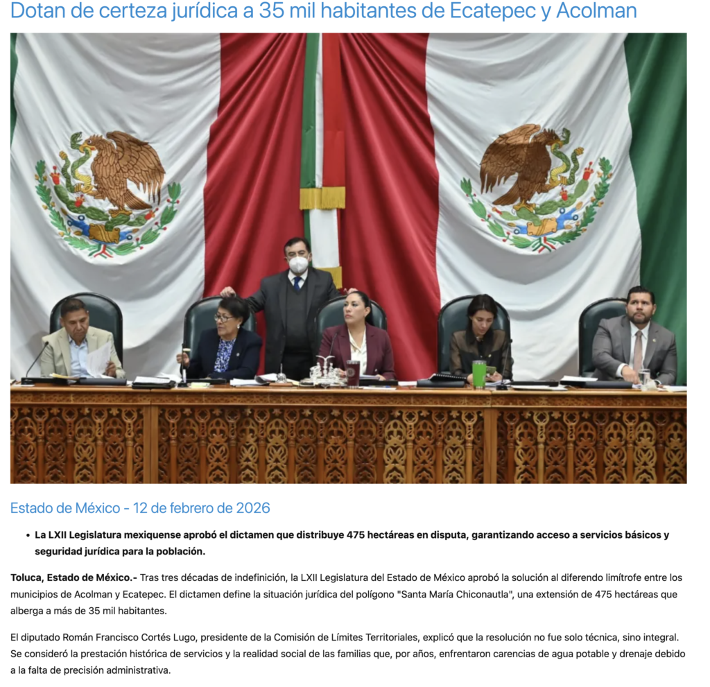 Tras tres décadas de indefinición, la LXII Legislatura del Estado de México aprobó la solución al diferendo limítrofe entre los municipios de Acolman y Ecatepec. El dictamen define la situación jurídica del polígono “Santa María Chiconautla”, una extensión de 475 hectáreas que alberga a más de 35 mil habitantes.