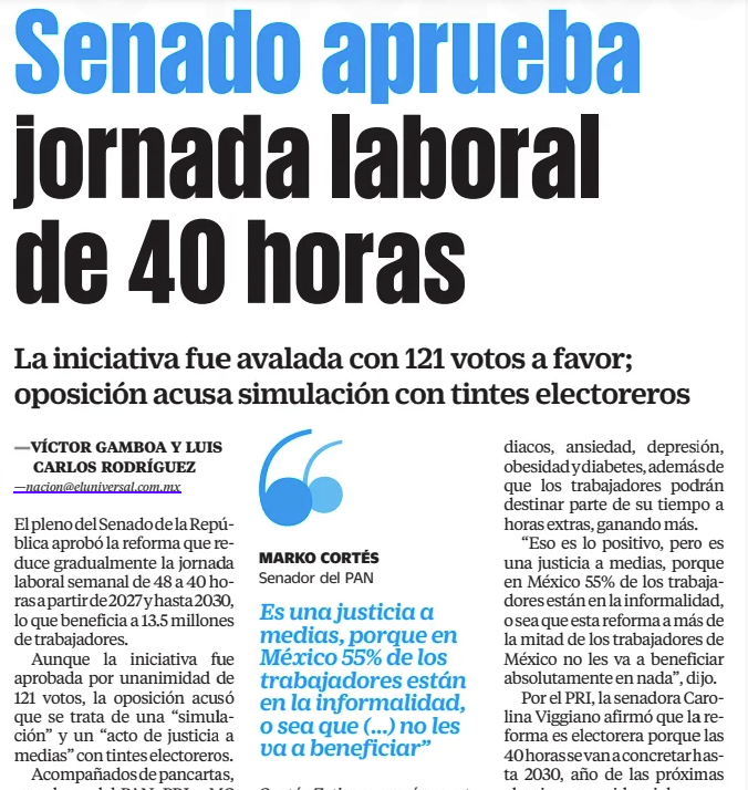 El Senado de la República aprobó por unanimidad el dictamen de reforma constitucional de jornada laboral para disminuir a 40 horas el tiempo de trabajo, así como para establecer un nuevo límite máximo al tiempo extraordinario y prohibir este último a personas menores de 18 años.