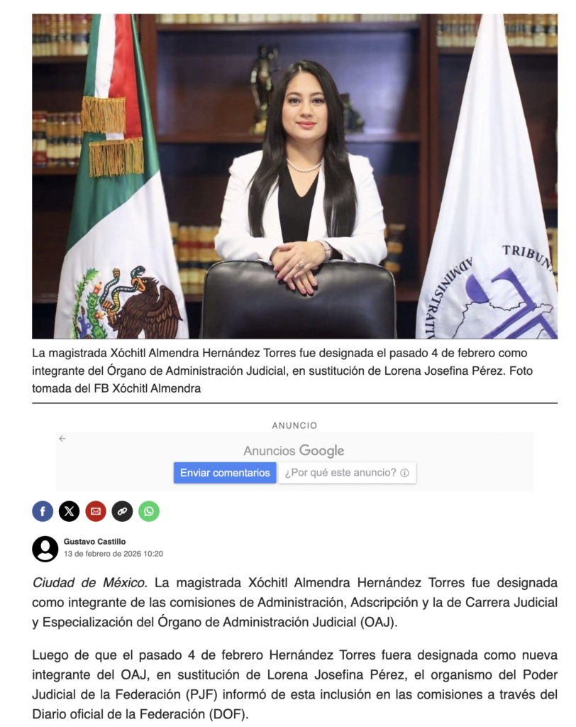 - https://www.jornada.com.mx/noticia/2026/02/13/politica/magistrada-xochitl-hernandez-torres-es-designada-en-comisiones-de-administracion-y-carrera-judicial-del-oaj