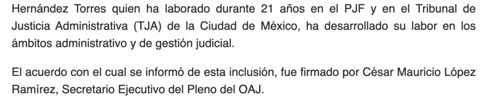 Luego de que el pasado 4 de febrero Hernández Torres fuera designada como nueva integrante del OAJ, en sustitución de Lorena Josefina Pérez, el organismo del Poder Judicial de la Federación (PJF) informó de esta inclusión en las comisiones a través del Diario oficial de la Federación (DOF).