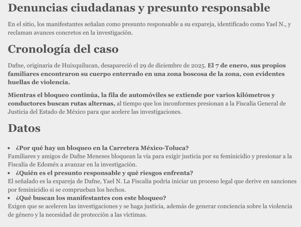 La Carretera México – Toluca estuvo bloqueada a la altura del paraje de La Marquesa, como medida de presión por parte de familiares y amigos de Dafne, quienes exigen justicia por su feminicidio e impiden el paso de vehículos con dirección a Toluca.