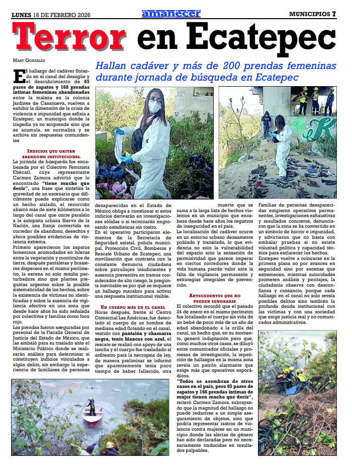 El hallazgo del cadáver flotando en el canal del desagüe y el descubrimiento de 65 pares de zapatos y 168 prendas íntimas femeninas abandonadas entre la maleza en la colonia Jardines de Casanueva, vuelven a exhibir la dimensión de la crisis deviolencia e impunidad que asfixia a Ecatepec, un municipio donde la tragedia ya no sorprende sino que se acumula, se normaliza y se archiva sin respuestas contundentes.