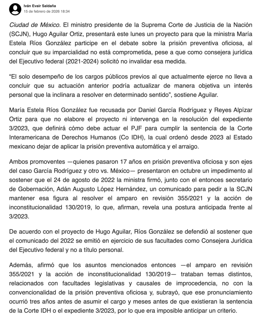 - https://www.jornada.com.mx/noticia/2026/02/15/politica/scjn-discutira-si-maria-estela-rios-puede-intervenir-en-caso-sobre-prision-preventiva-oficiosa