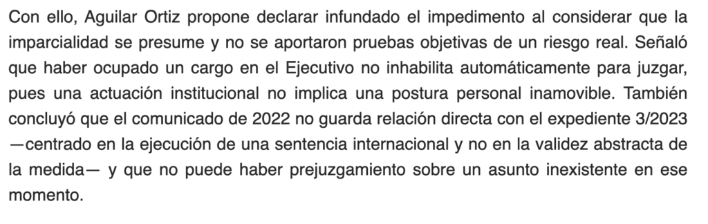 El ministro presidente de la Suprema Corte de Justicia de la Nación (SCJN), Hugo Aguilar Ortiz, presentará este lunes un proyecto para que la ministra María Estela Ríos González participe en el debate sobre la prisión preventiva oficiosa, al concluir que su imparcialidad no está comprometida, pese a que como consejera jurídica del Ejecutivo federal (2021-2024) solicitó no invalidar esa medida.
