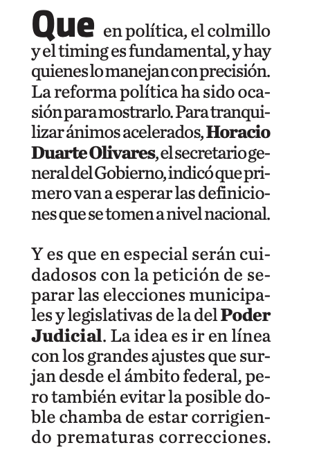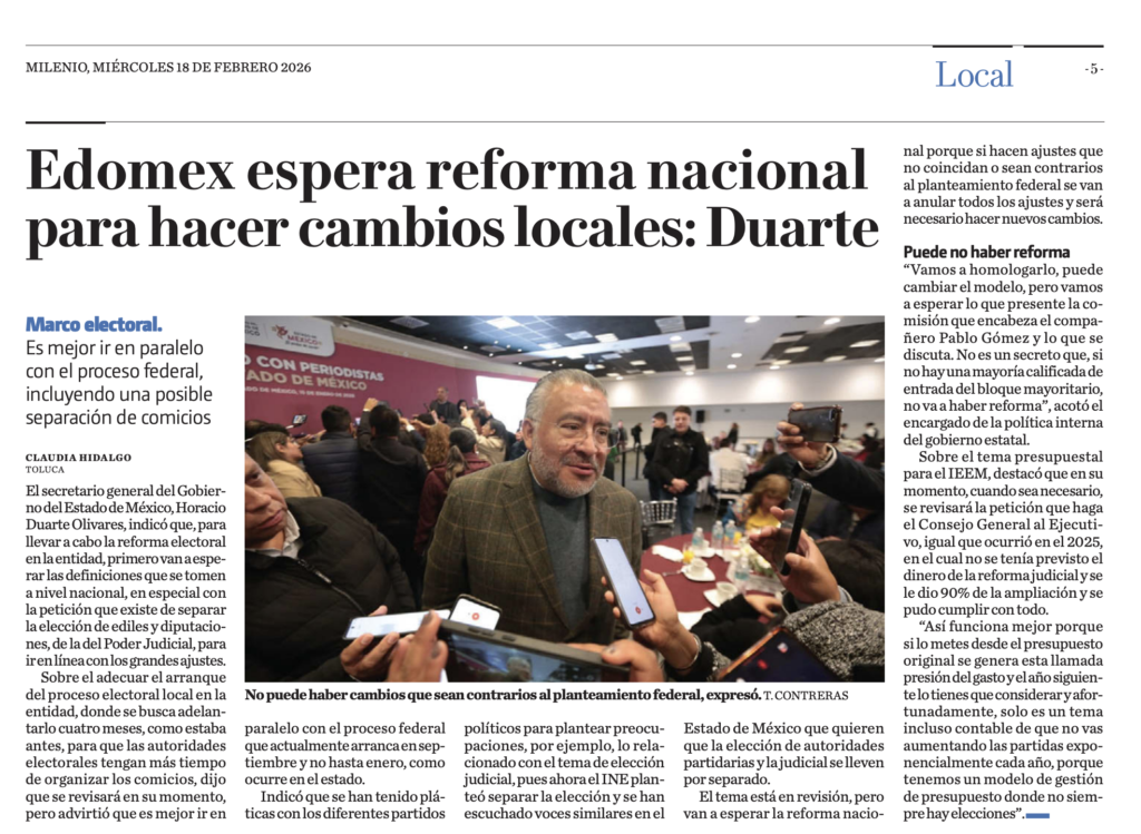 El secretario general del Gobierno del Estado de México, Horacio Duarte Olivares, indicó que, para llevar a cabo la reforma electoral en la entidad, primero van a esperar las definiciones que se tomen a nivel nacional, en especial con la petición que existe de separar la elección de ediles y diputaciones, de la del Poder Judicial, para ir en línea con los grandes ajustes.
