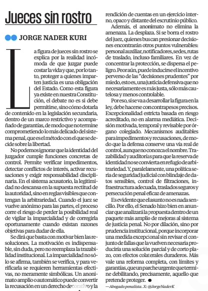 La figura de jueces sin rostro se explica por la realidad incómoda de que juzgar puede costar la vida y que, por lo tanto, proteger a quienes imparten justicia es una obligación del Estado. Como esta figura ya existe en nuestra Constitución, el debate no es si debe permitirse, sino cómo dotarla de contenido en la legislación secundaria, dentro de un marco restrictivo y acompañado de garantías, de modo que no termine comprometiendo lo más delicado del sistema penal, que es el método con el que se decide sobre la libertad.