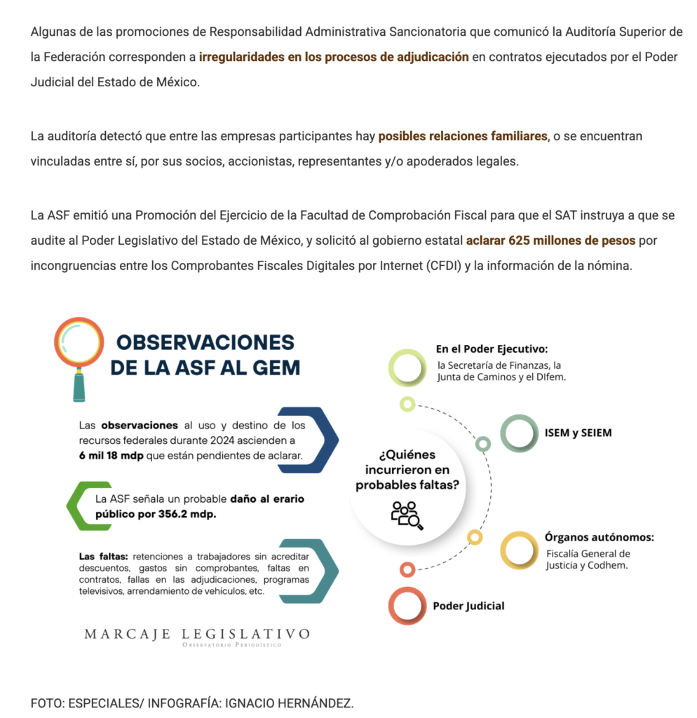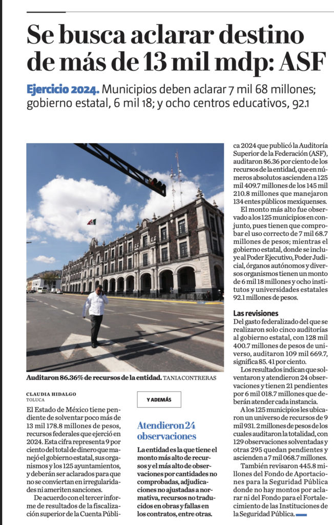 La Auditoría Superior de la Federación (ASF) observó más de 6 mil 18 millones de pesos en el manejo de recursos federales que hicieron diversas instancias al recurso federal que recibió el Gobierno del Estado de México durante 2024, donde se incluyen organismos descentralizados, órganos autónomos, el Poder Judicial y dependencias del Poder Ejecutivo.