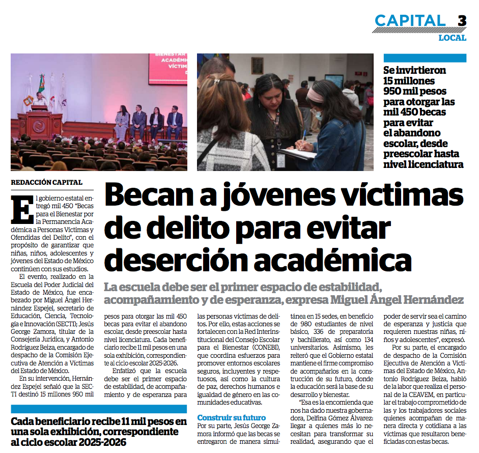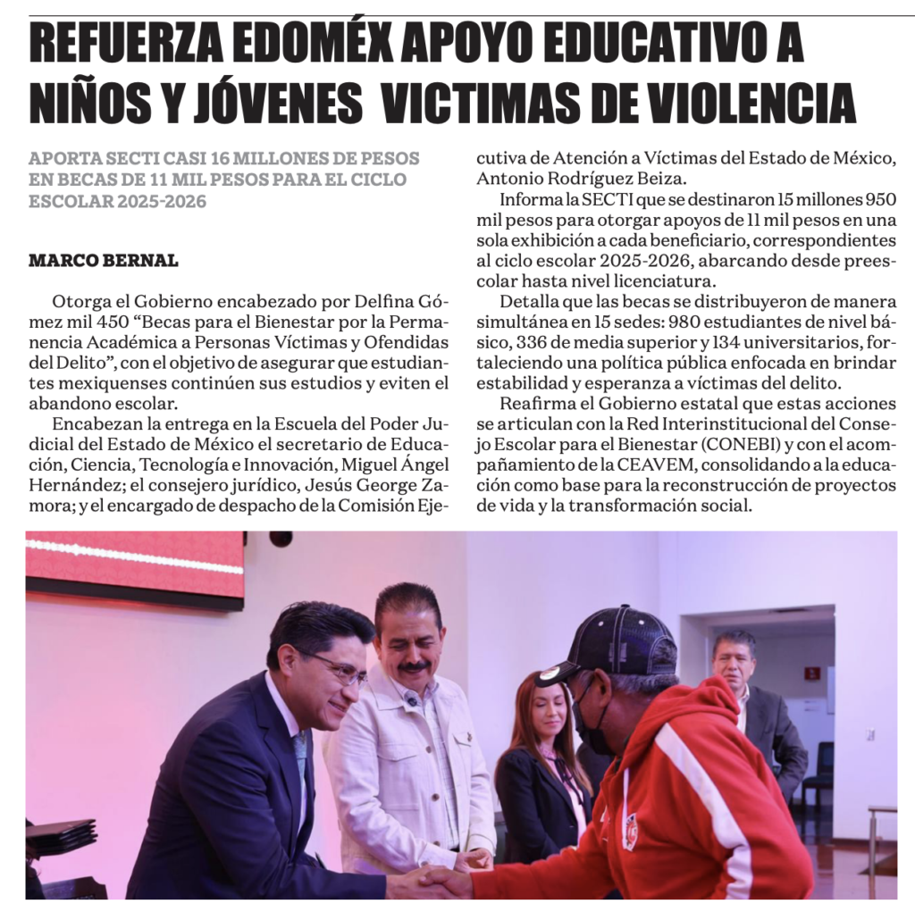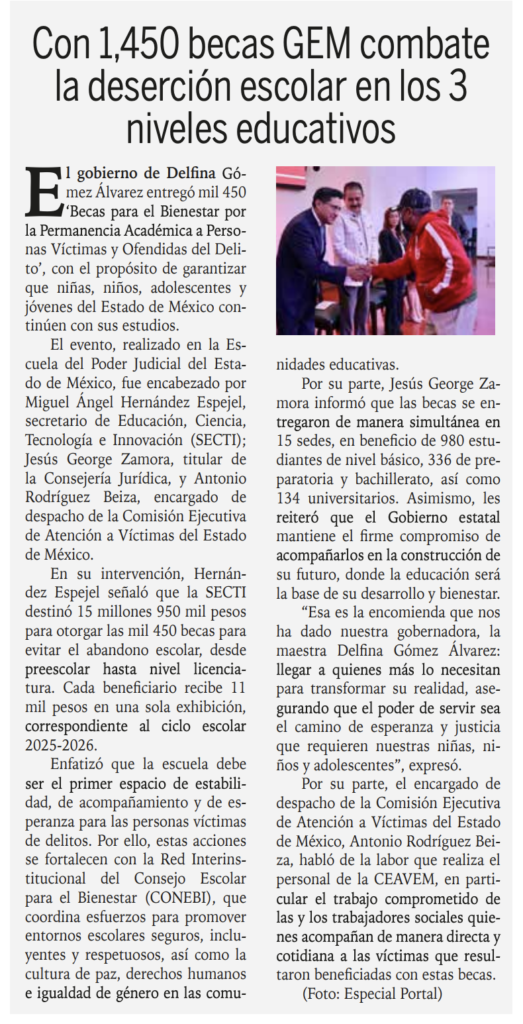 Otorga el Gobierno encabezado por Delfina Gómez mil 450 “Becas para el Bienestar por la Permanencia Académica a Personas Víctimas y Ofendidas del Delito”, con el objetivo de asegurar que estudiantes mexiquenses continúen sus estudios y eviten el abandono escolar.