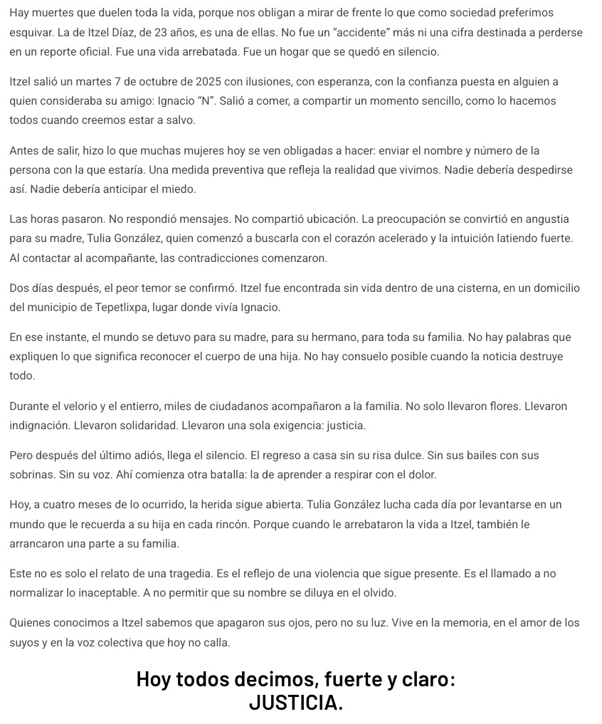 Hay muertes que duelen toda la vida, porque nos obligan a mirar de frente lo que como sociedad preferimos esquivar. La de Itzel Díaz, de 23 años, es una de ellas. No fue un “accidente” más ni una cifra destinada a perderse en un reporte oficial. Fue una vida arrebatada. Fue un hogar que se quedó en silencio.