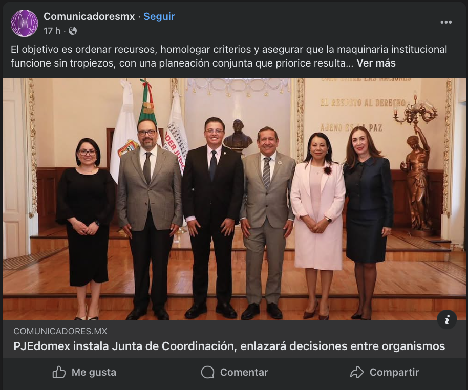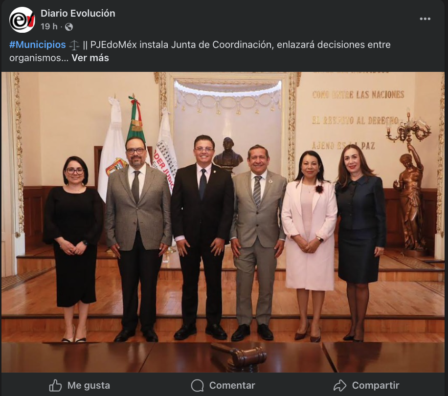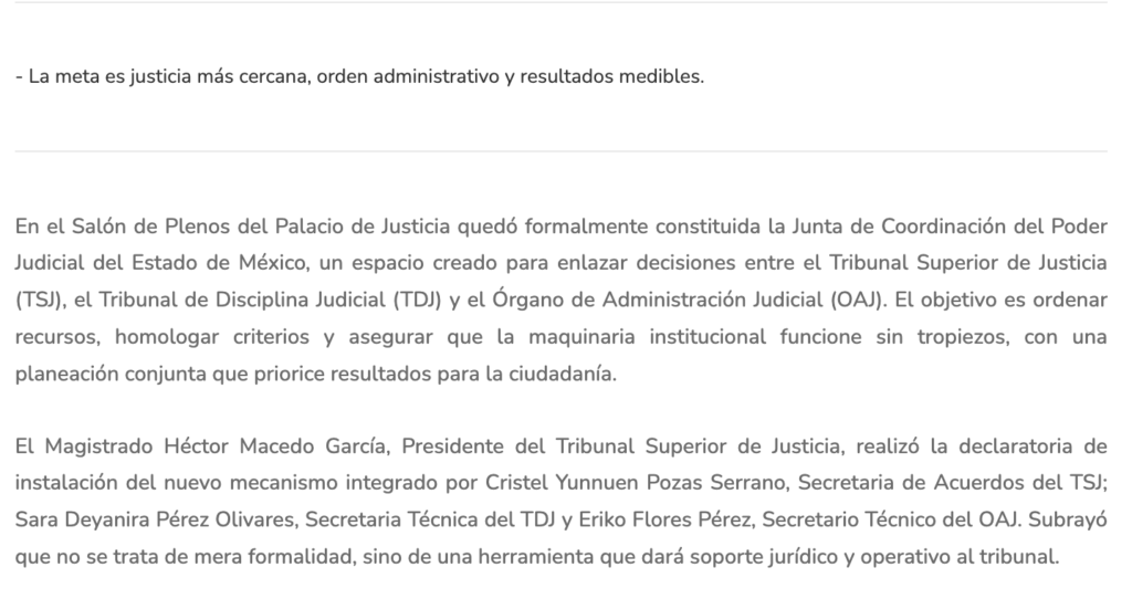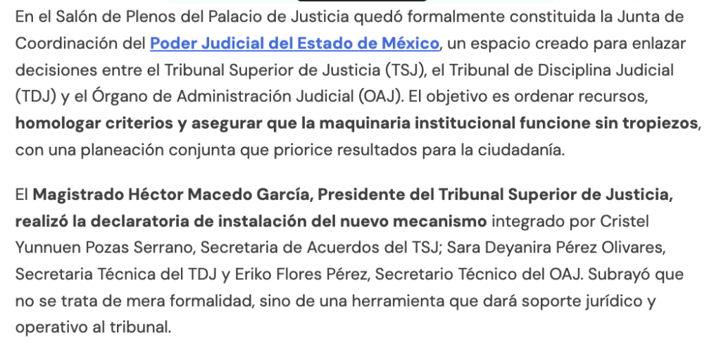 - https://www.diarioevolucion.com.mx/pjedomex-instala-junta-de-coordinacion-enlazara-decisiones-entre-organismos/?fbclid=IwY2xjawQGhl9leHRuA2FlbQIxMABicmlkETJTcVJHczlmdlJZSko1YnVVc3J0YwZhcHBfaWQQMjIyMDM5MTc4ODIwMDg5MgABHliupctQkimGGmvm5nyYenqtat-BP7pVEH9BzwpYyKP7WdqaPPoGSo67Jsjk_aem_dxseCmQC37uXa3HcYoK8WQ