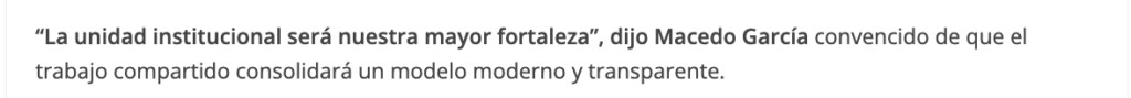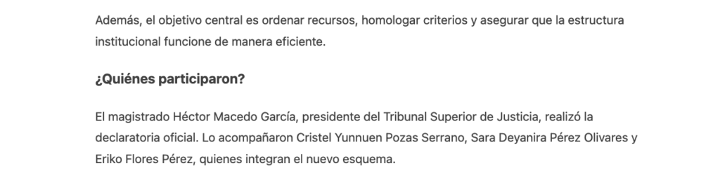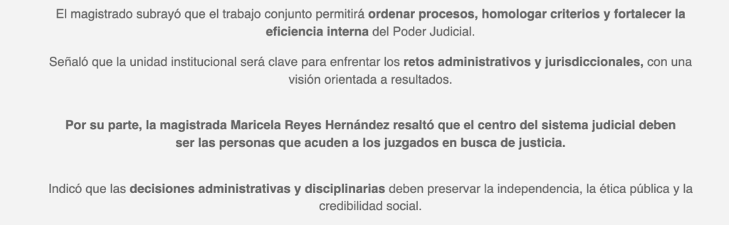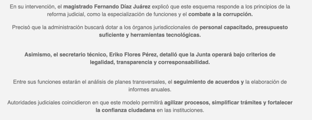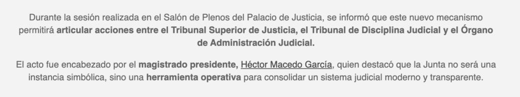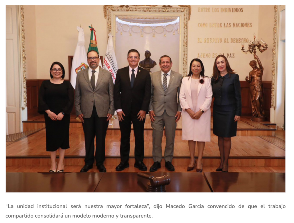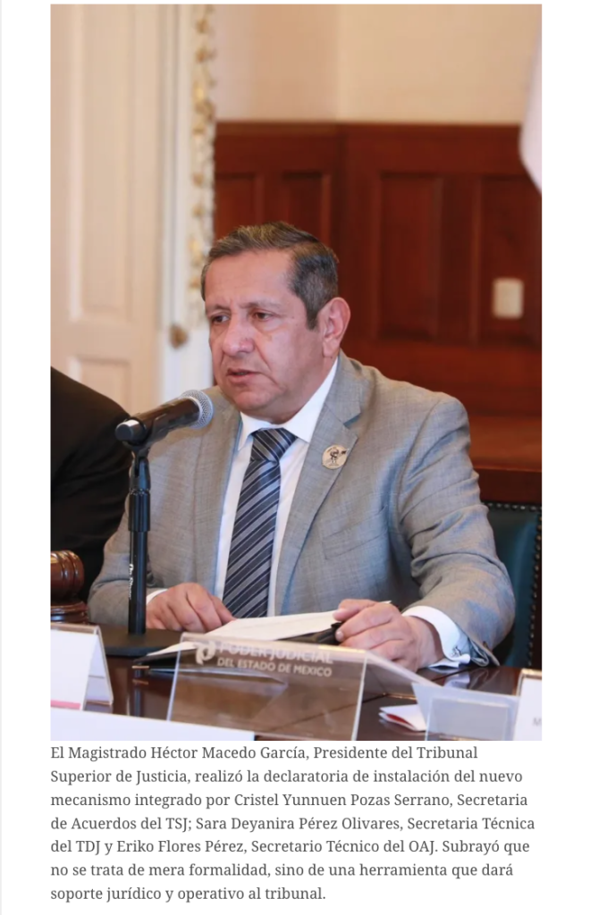 El Magistrado Héctor Macedo García, Presidente del Tribunal Superior de Justicia, realizó la declaratoria de instalación del nuevo mecanismo integrado por Cristel Yunnuen Pozas Serrano, Secretaria de Acuerdos del TSJ; Sara Deyanira Pérez Olivares, Secretaria Técnica del TDJ y Eriko Flores Pérez, Secretario Técnico del OAJ. Subrayó que no se trata de mera formalidad, sino de una herramienta que dará soporte jurídico y operativo al tribunal.
