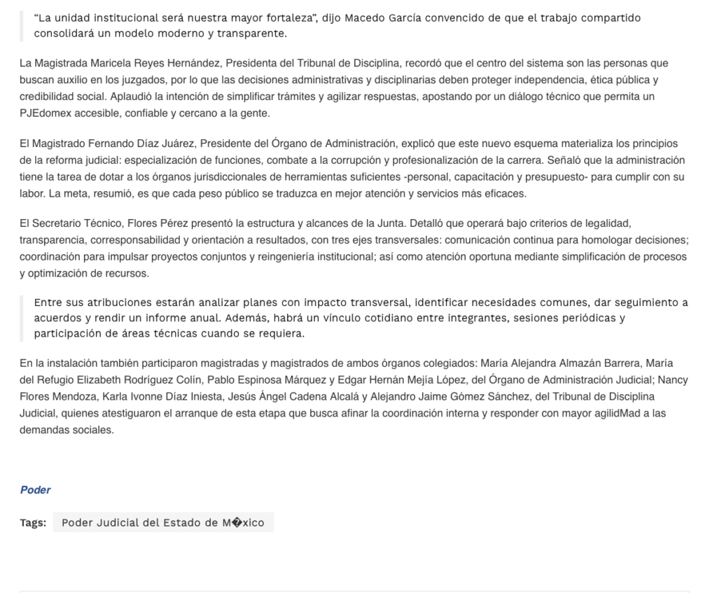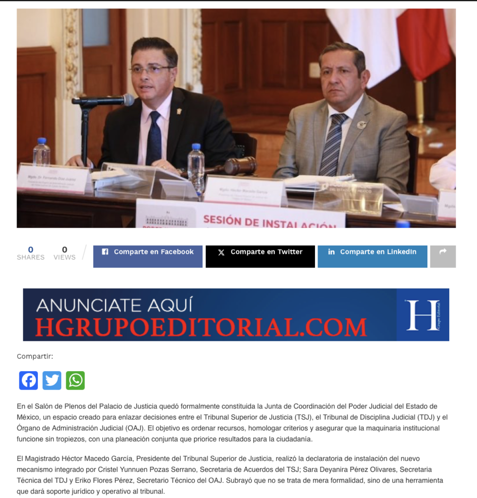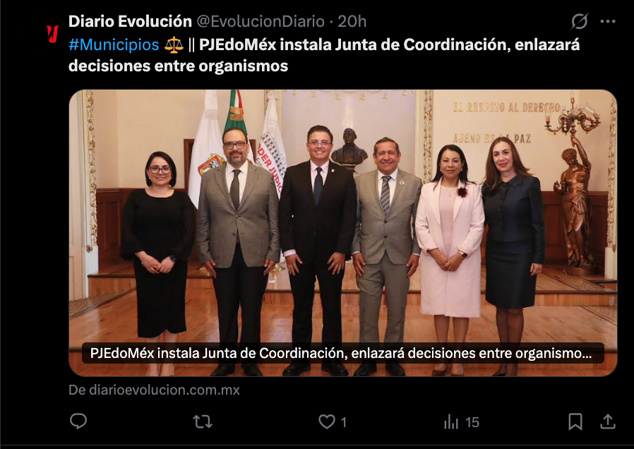 - https://www.diarioevolucion.com.mx/pjedomex-instala-junta-de-coordinacion-enlazara-decisiones-entre-organismos/?fbclid=IwY2xjawQGhl9leHRuA2FlbQIxMABicmlkETJTcVJHczlmdlJZSko1YnVVc3J0YwZhcHBfaWQQMjIyMDM5MTc4ODIwMDg5MgABHliupctQkimGGmvm5nyYenqtat-BP7pVEH9BzwpYyKP7WdqaPPoGSo67Jsjk_aem_dxseCmQC37uXa3HcYoK8WQ