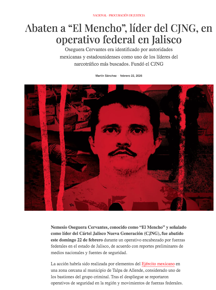 Nemesio Oseguera Cervantes, conocido como “El Mencho” y señalado como líder del Cártel Jalisco Nueva Generación (CJNG), fue abatido este domingo 22 de febrero durante un operativo encabezado por fuerzas federales en el estado de Jalisco, de acuerdo con reportes preliminares de medios nacionales y fuentes de seguridad.