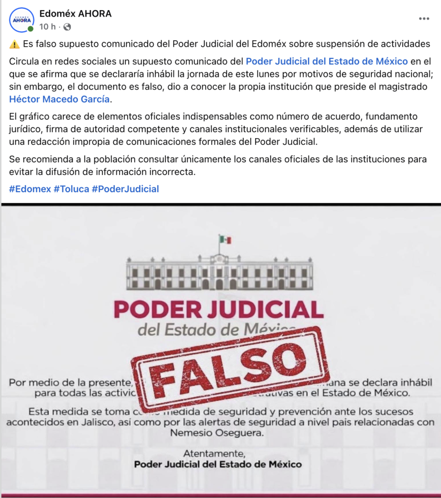 Circula en redes sociales un supuesto comunicado del Poder Judicial del Estado de México en el que se afirma que se declararía inhábil la jornada de este lunes por motivos de seguridad nacional; sin embargo, el documento es falso, dio a conocer la propia institución que preside el magistrado Héctor Macedo García.