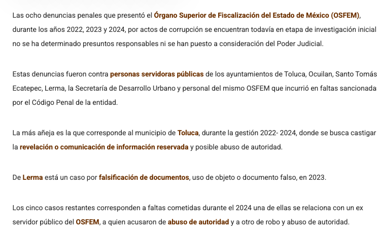 Las ocho denuncias penales que presentó el Órgano Superior de Fiscalización del Estado de México (OSFEM) durante los años 2022, 2023 y 2024, por actos de corrupción se encuentran todavía en etapa de investigación inicial no se ha determinado presuntos responsables ni se han puesto a consideración del Poder Judicial.