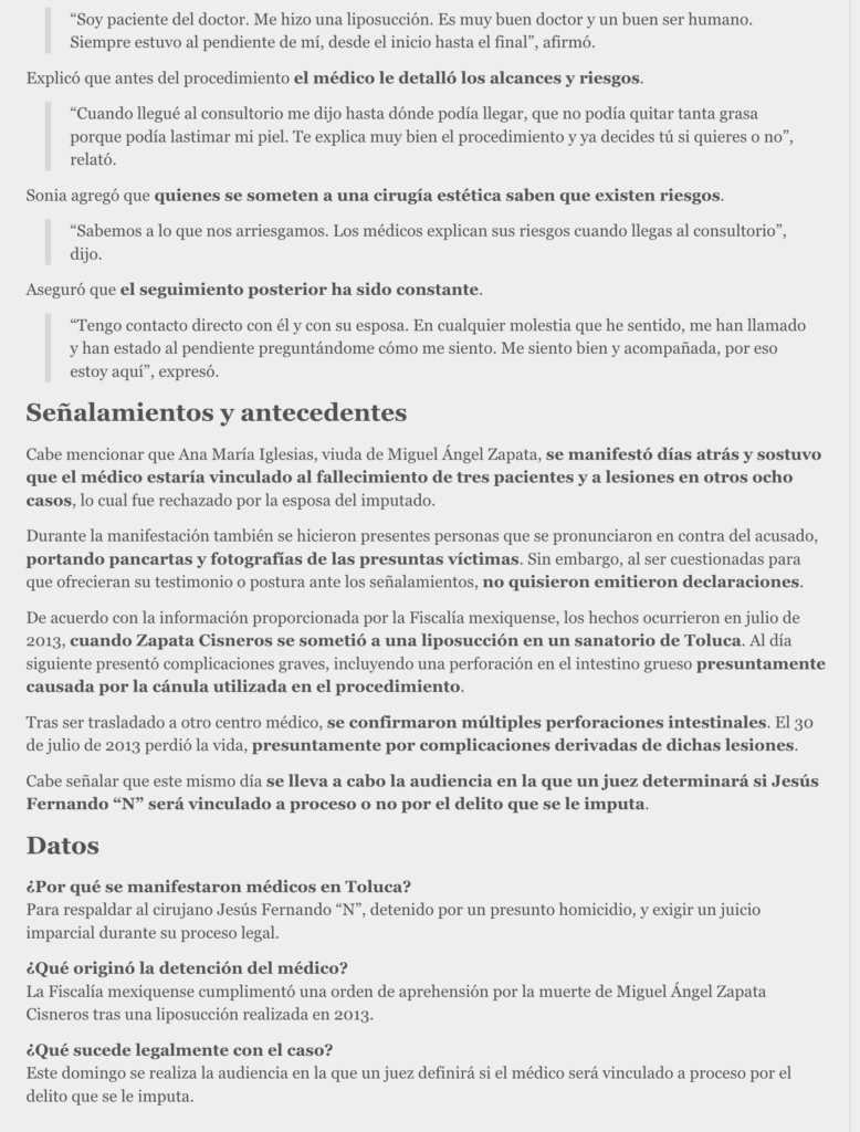 Con consignas como “Juicio justo”, “Somos médicos, no somos asesinos” y “Fernando no estás solo”, familiares, pacientes y médicos del Valle de Toluca se manifiestan este domingo en los juzgados del Penal de Santiaguito, en respaldo del cirujano plástico Jesús Fernando “N”, detenido por su presunta participación en el delito de homicidio.