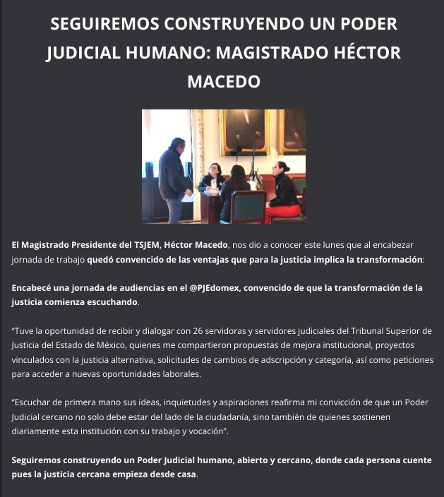 El Magistrado Presidente del TSJEM, Héctor Macedo, nos dio a conocer este lunes que al encabezar jornada de trabajo quedó convencido de las ventajas que para la justicia implica la transformación: