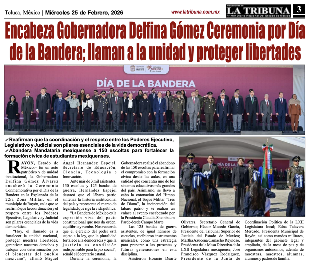 Ante más de 3 mil asistentes, 150 escoltas y 125 bandas de guerra, la gobernadora del Estado de México se realizó la Ceremonia Conmemorativa por el Día de la Bandera en la Explanada de la 22/a Zona Militar, encabezada por la gobernadora Delfina Gómez Álvarez