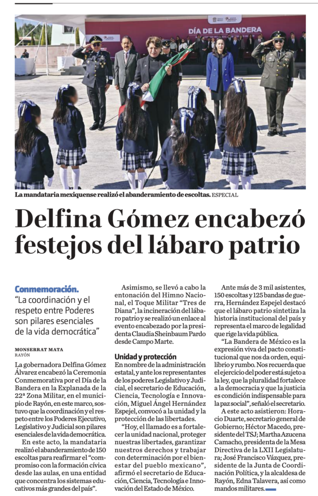 Ante más de 3 mil asistentes, 150 escoltas y 125 bandas de guerra, la gobernadora del Estado de México se realizó la Ceremonia Conmemorativa por el Día de la Bandera en la Explanada de la 22/a Zona Militar, encabezada por la gobernadora Delfina Gómez Álvarez