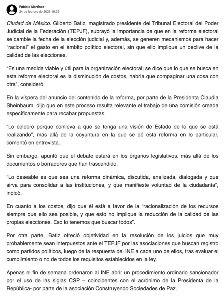 - https://www.jornada.com.mx/noticia/2026/02/24/politica/gilberto-batiz-plantea-cambiar-fecha-de-eleccion-judicial-para-reducir-costos-sin-afectar-democracia