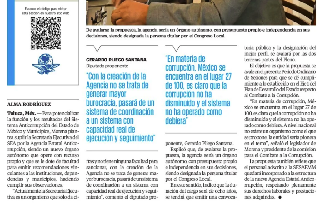 Para potencializar la función y los resultados del Sistema Anticorrupción del Estado de México y Municipios, Morena plantea suplir la Secretaría Ejecutiva del SEA por la Agencia Estatal Anticorrupción, siendo un nuevo órgano autónomo que opere con recurso propio y que se le dote de facultad para emitir recomendaciones vinculantes a las instituciones, dependencias y municipios, haciendo cumplir sus observaciones.