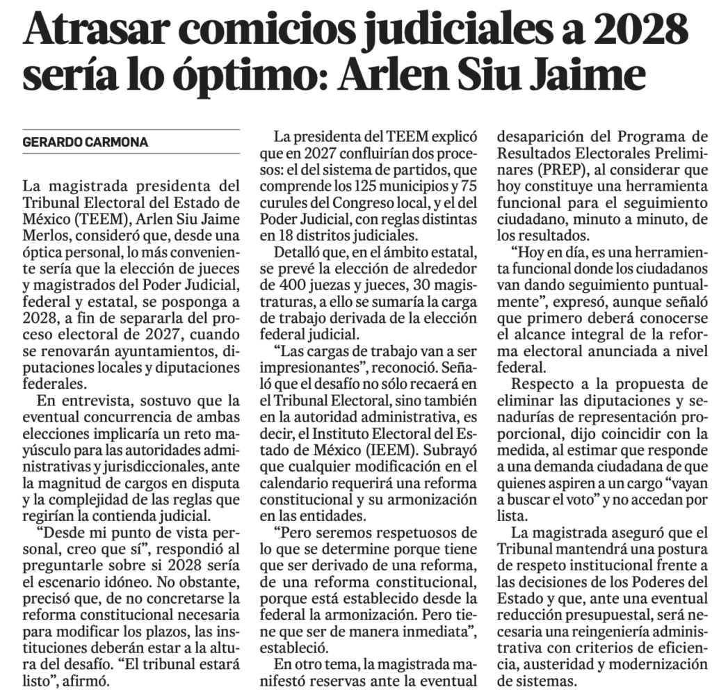 La magistrada presidenta del Tribunal Electoral del Estado de México (TEEM), Arlen Siu Jaime Merlos, consideró que, desde una óptica personal, lo más conveniente sería que la elección de jueces y magistrados del Poder Judicial, federal y estatal, se posponga a 2028, a fin de separarla del proceso electoral de 2027, cuando se renovarán ayuntamientos, diputaciones locales y diputaciones federales.