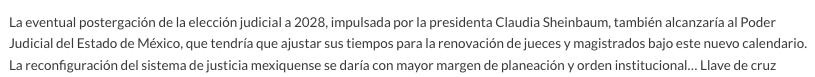 La eventual postergación de la elección judicial a 2028, impulsada por la presidenta Claudia Sheinbaum, también alcanzaría al Poder Judicial del Estado de México, que tendría que ajustar sus tiempos para la renovación de jueces y magistrados bajo este nuevo calendario. La reconfiguración del sistema de justicia mexiquense se daría con mayor margen de planeación y orden institucional… Llave de cruz