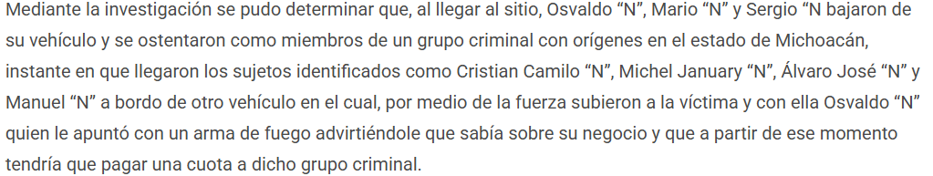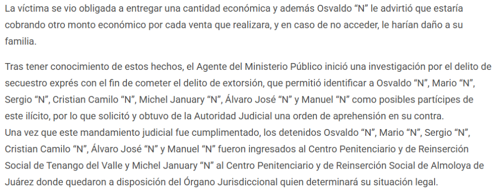 Elementos de la Fiscalía General de Justicia del Estado de México (FGJEM) cumplimentaron 7 órdenes de aprehensión en contra de siete sujetos identificados como Osvaldo “N”, Mario “N”, Sergio “N”, Cristian Camilo “N”, Michel January “N”, Álvaro José “N” y Manuel “N” por su probable participación en el delito de secuestro exprés con fines de cometer el delito de extorsión, en el municipio de Tenango del Valle.