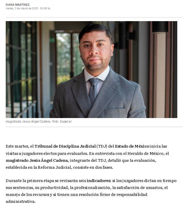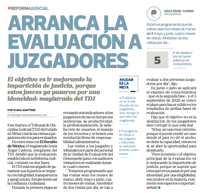 Este martes, el Tribunal de Disciplina Judicial (TDJ) del Estado de México inicia las visitas a juzgadores electos para evaluarlos. En entrevista con El Heraldo de México, el magistrado Jesús Ángel Cadena, integrante del TDJ, detalló que la evaluación, establecida en la Reforma Judicial, consiste en dos fases.