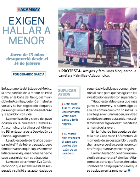 En la zona norte del Estado de México, la desaparición de la menor de edad Catia, en la Caña del Gallo, del municipio de Acambay, detonó el malestar social y se han registrado bloqueos para exigir la investigación en el caso y la aparición con vida. La movilización y cierre del paso ocurrió en la carretera Palmillas–Atlacomulco, a la altura del kilómetro 93, en la zona de la Desviación La Florida–Agostadero.