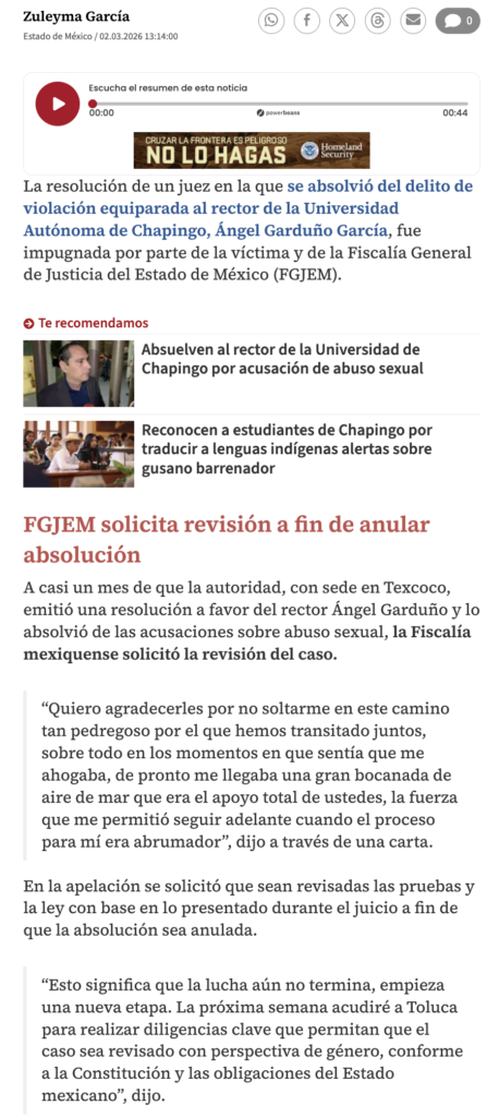 La resolución de un juez en la que se absolvió del delito de violación equiparada al rector de la Universidad Autónoma de Chapingo, Ángel Garduño García, fue impugnada por parte de la víctima y de la Fiscalía General de Justicia del Estado de México (FGJEM).