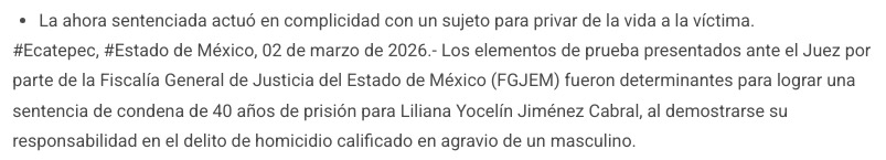 - https://reporterosenmovimiento.com/2026/03/02/logra-la-fiscalia-del-edomex-que-un-juez-dicte-sentencia-de-40-anos-de-prision-contra-la-responsable-del-delito-de-homicidio/