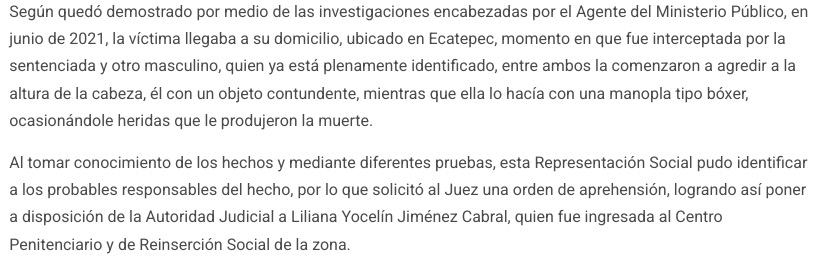 Una vez vinculada a proceso, la Fiscalía aportó los elementos de prueba suficientes para tratar de demostrar su participación en el hecho, tras lo cual el Órgano Jurisdiccional determinó la culpabilidad de Liliana Yocelín Jiménez Cabral en el delito de homicidio calificado, sentenciándola a 40 años de prisión.